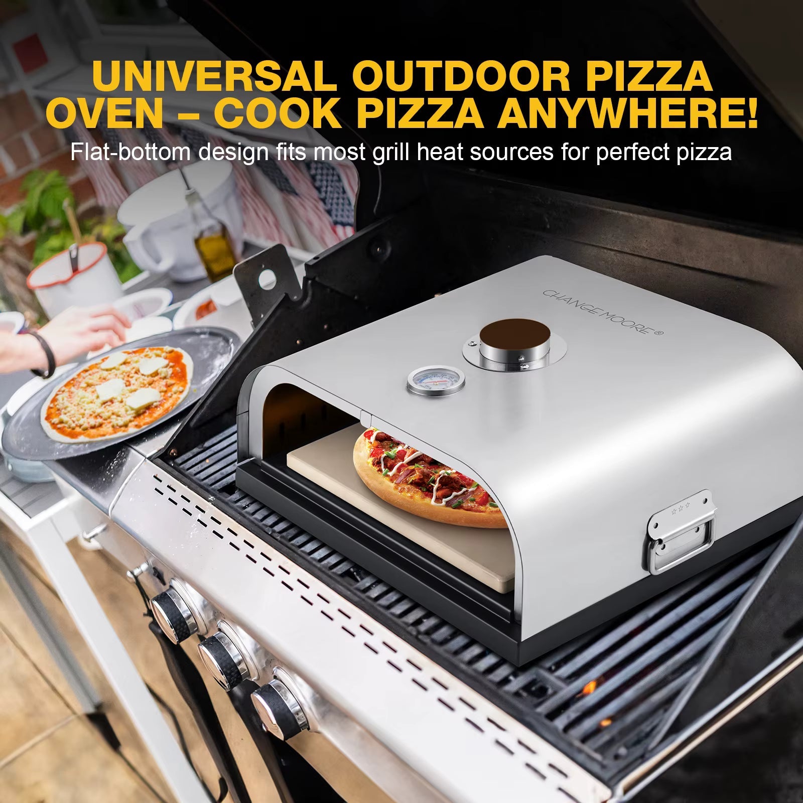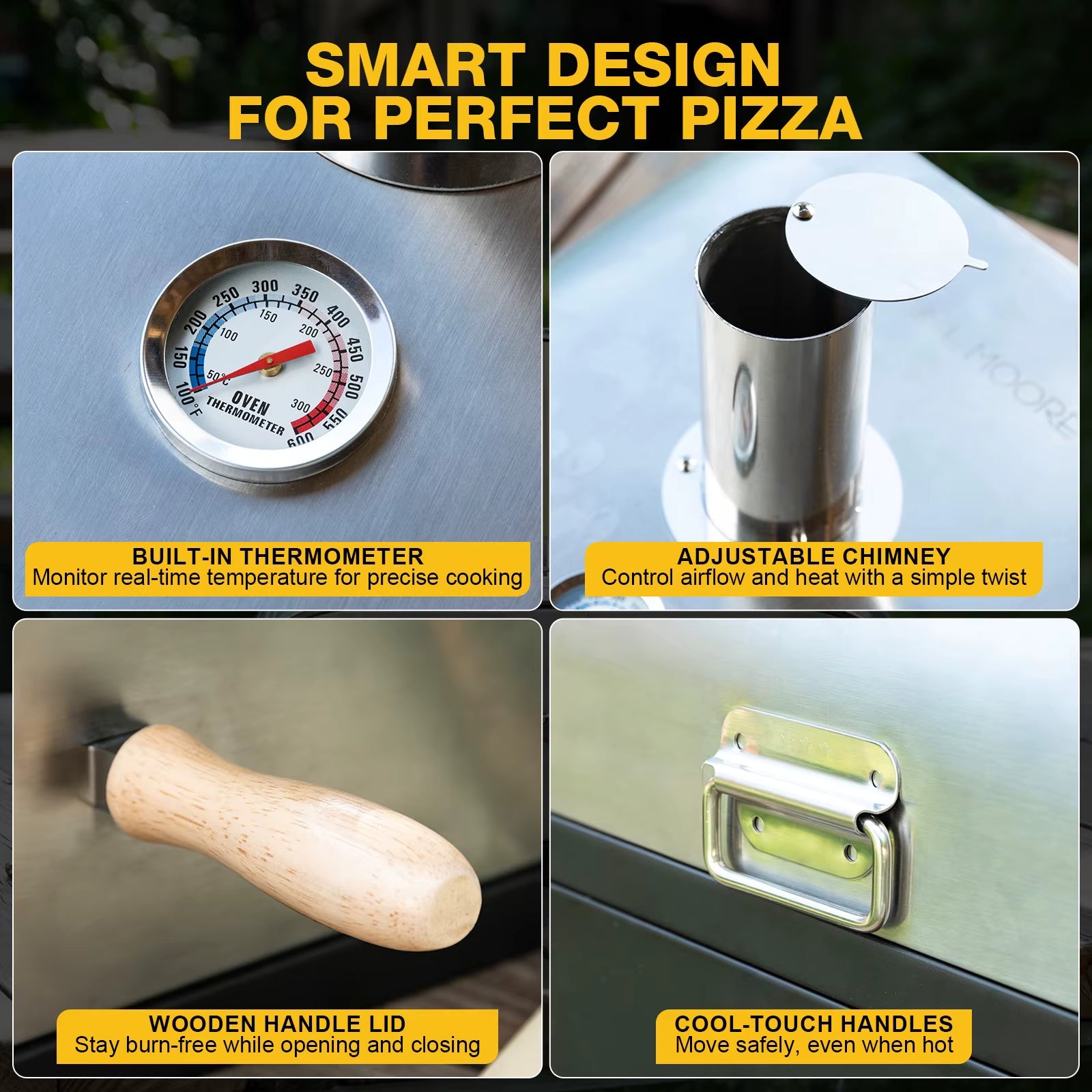 Four à pizza extérieur portable multifonction conçu pour une cuisson authentique au feu de bois ou au charbon. Équipé d’une pierre en cordiérite de qualité professionnelle, il atteint jusqu’à 900°F (≈480°C) pour des pizzas napolitaines croustillantes et parfaitement cuites.