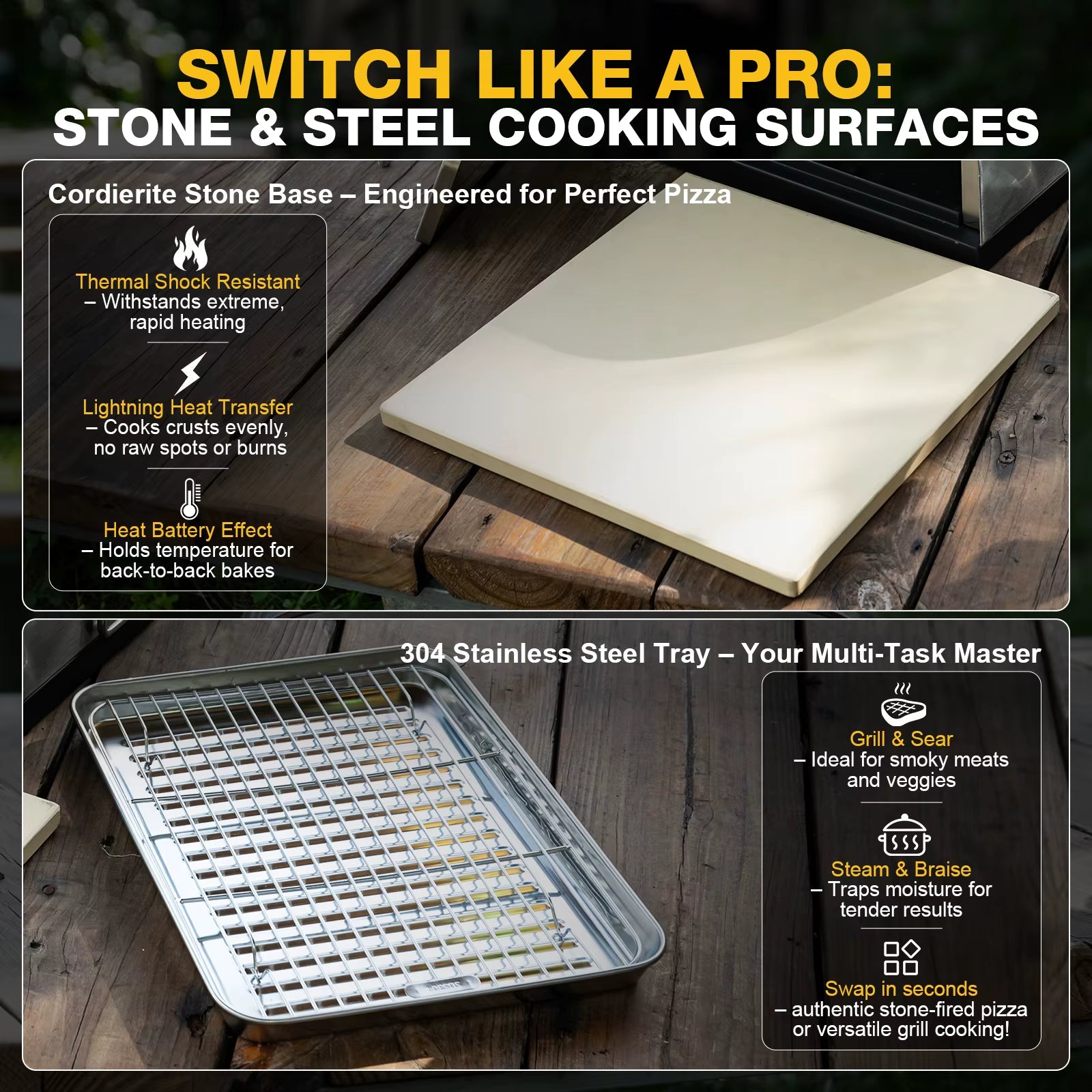Grâce à son système double mode, remplacez facilement la pierre à pizza par une plaque de gril en acier inoxydable 304 pour griller steaks, légumes ou viandes directement sur la flamme. Le thermomètre intégré permet un contrôle précis de la température en temps réel.